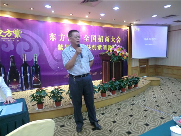 当天第一个签约成功的代理商代表庄先生来自广东惠州。他受主持人邀请到台上讲述自己加盟东方紫的感受,并对全体加盟东方紫的伙伴致以祝福,对东方紫紫酒的前景致以最美好的祝愿。