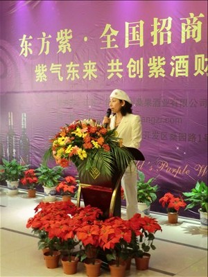 江苏句容九州桑果酒业有限公司总裁陈女士向与会经销商介绍公司的招商政策等内容。拥有一个强有力的执行团队,使得公司在实际工作中能够切实落实对代理商的承诺,并保障东方紫代理网络长足发展。