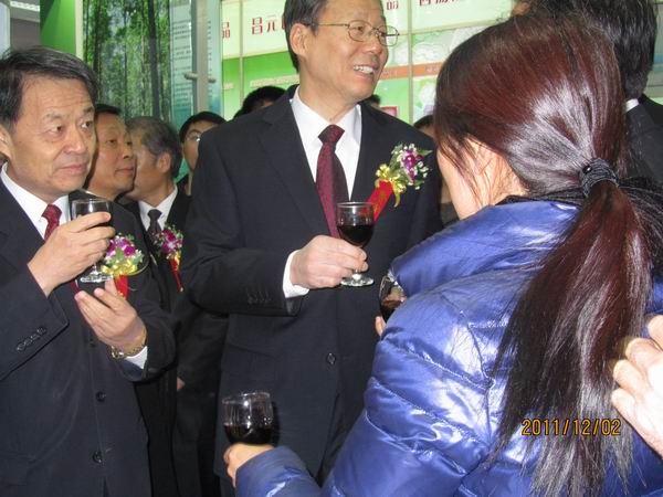[杨传堂主任、李学勇省长品尝桑椹酿造的东方紫酒]
