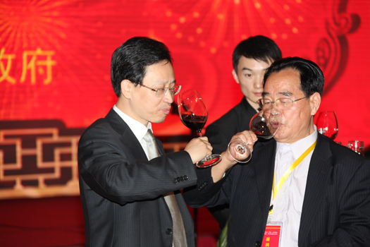 [参加首届中国养生论坛贵宾在饮用紫酒 祝贺会议胜利开幕]