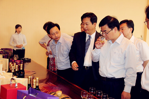 调研期间,尹卫东书记就东方紫的情况进行了说明。高董事长为杨省世、李雪峰、尹卫东、许文等领导同志介绍了东方紫的企业文化和紫酒产品。杨省世书记听取了介绍,并了解了桑椹紫酒、桑椹白兰地等东方紫·紫酒产品。