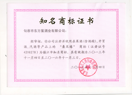 东方紫酒业“桑菓缘”商标被评为镇江市知名商标