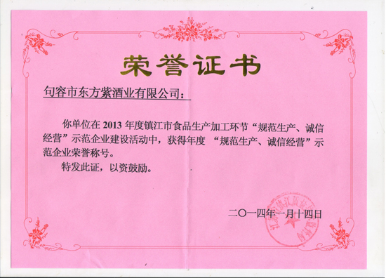 公司获得镇江市质量技术监督局2013年度“规范生产诚信经营”企业