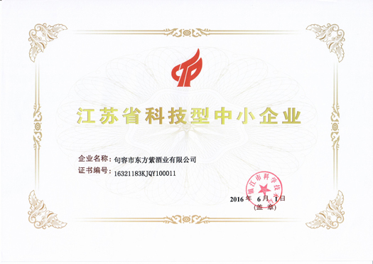 句容东方紫酒业有限公司获得镇江市科技技术局颁发的“江苏省科技型中小企业称号”。
