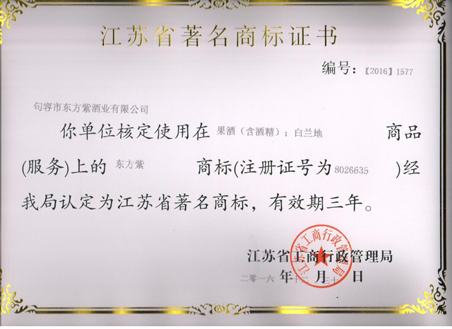 东方紫酒业“东方紫”商标被认定为江苏省著名商标