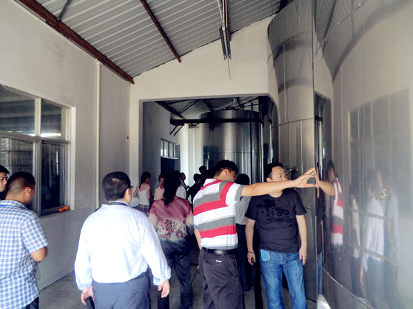 [ 图为经销商参观车间内的恒温储酒罐。]