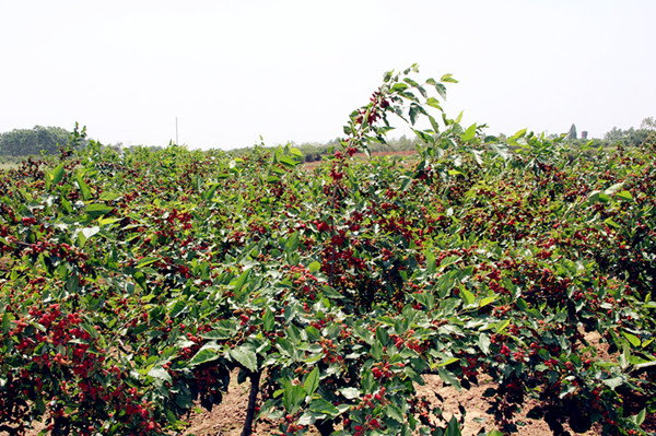 这片面积广大的桑椹园就是东方紫酒在句容的原料产区。他们的名字叫做“桑果1号”12年前从台湾迁徙到句容安家落户,他们或许没有其他品种的桑椹树那样有着高大的身材、雄壮的身形,但他们那娇小的身躯上所孕育的那累累的果实就让他独树一帜。这些桑椹树在句容福地的阳光雨水的滋润下,现在已经结出了桑椹,青的、红的、紫的,一串串的挂在桑椹树那细小的树枝上,让人担心那树枝会不会被压断。就连那刚置入土中的树苗都不让老树专美于前,也在那稚嫩的身躯上挂上了一棵棵饱满的桑椹,在路边吸引着游人的目光。